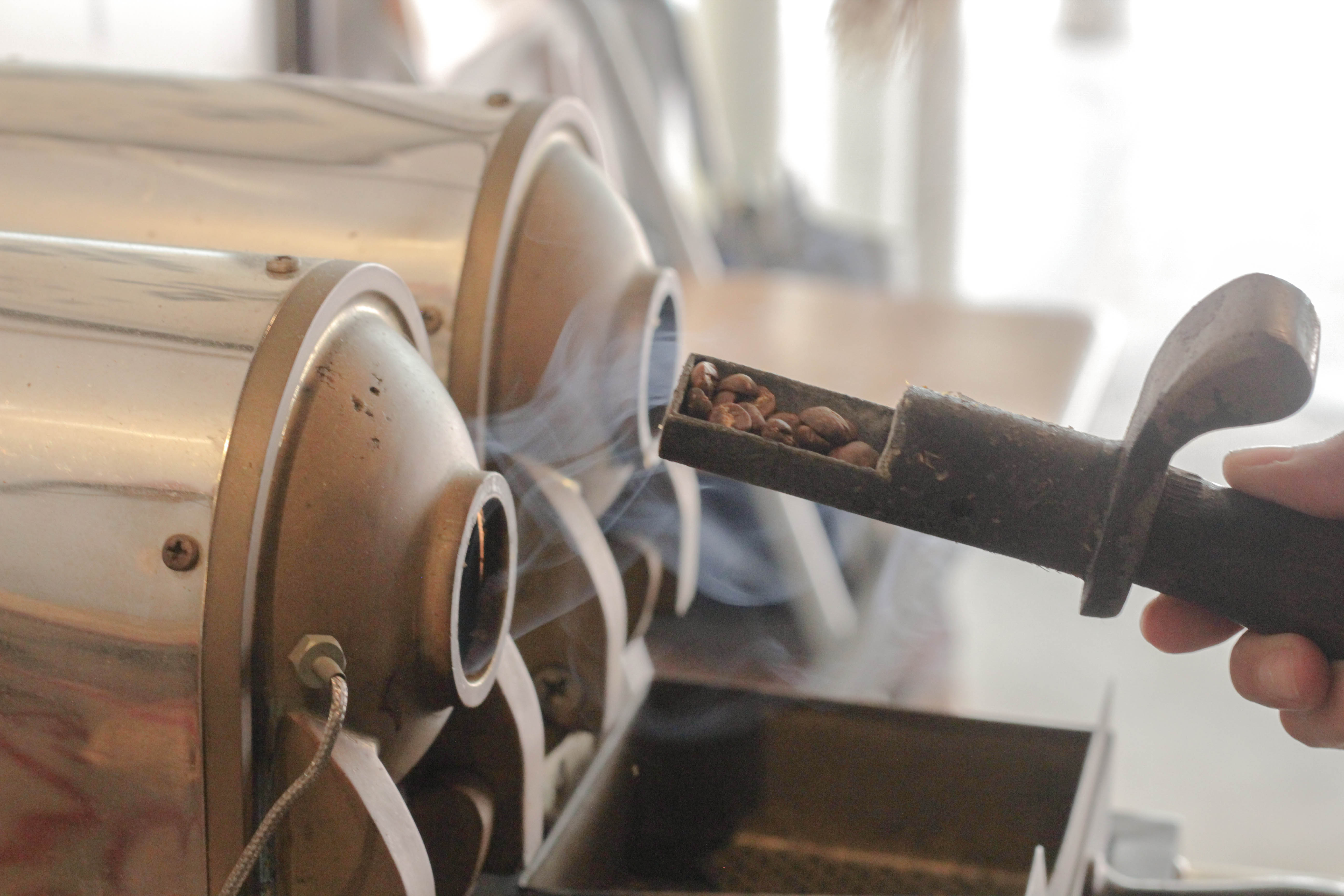 在烘培咖啡豆时,必须定时从仪器中取出咖啡豆,以正确拿捏咖啡豆的烘培程度。 摄影:陈可庭