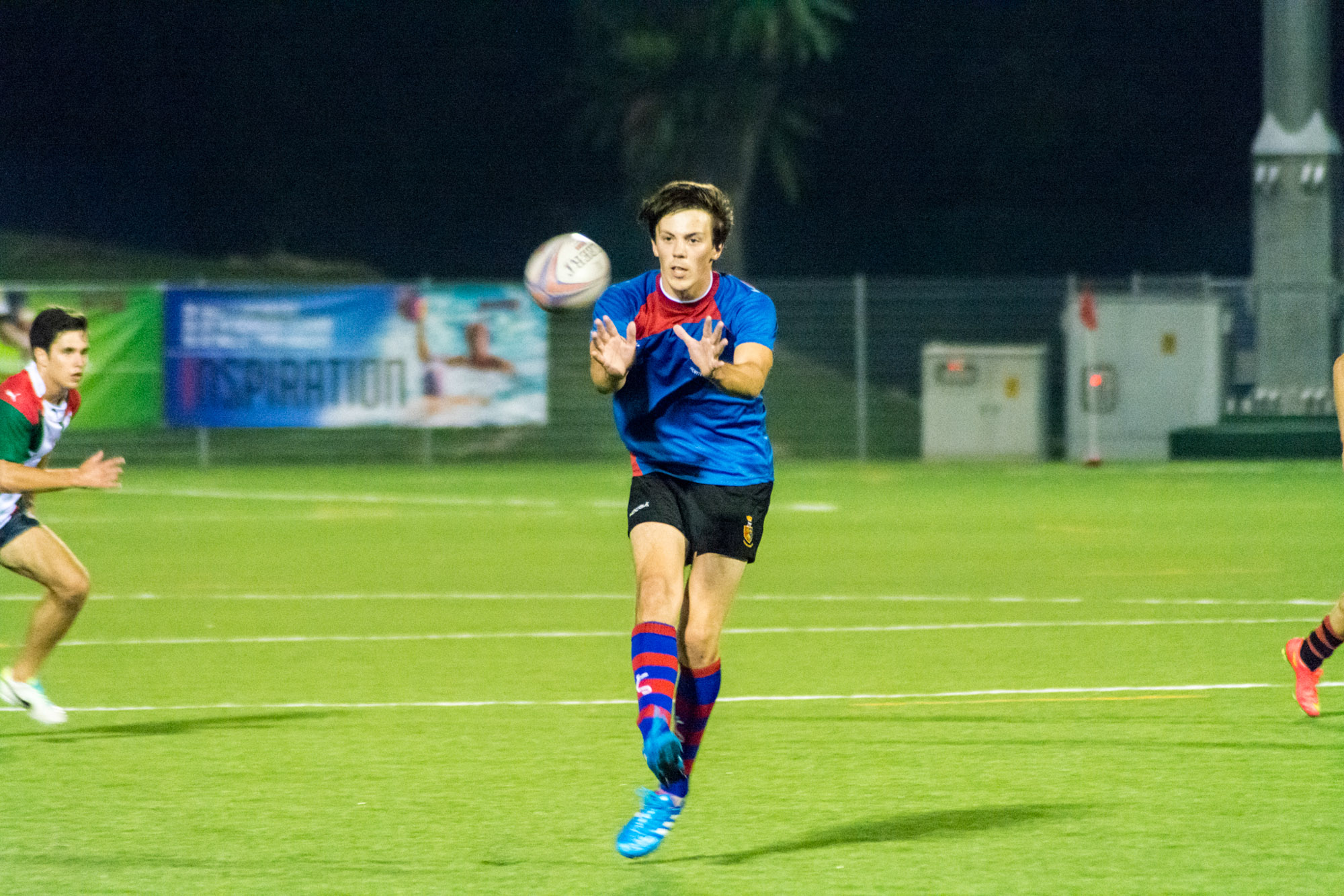 SWEATING IT OUT: George Rodgers, 21, who is also from England, catches the ball during an NTU Rugby training session in the evening. The third-year Aerospace Engineering student shared that it took a couple of weeks to adapt to Singapore’s humidity, considering that rugby is a winter sport in his hometown.                                        PHOTO: CEPHEUS CHAN