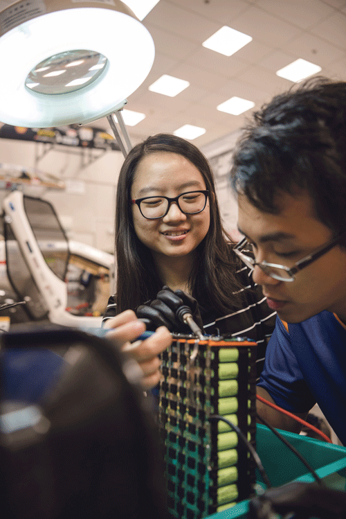 Emily helps Joandy Leonata Pratama, 20-year-old second year MAE student, solder the battery used for the race car.
