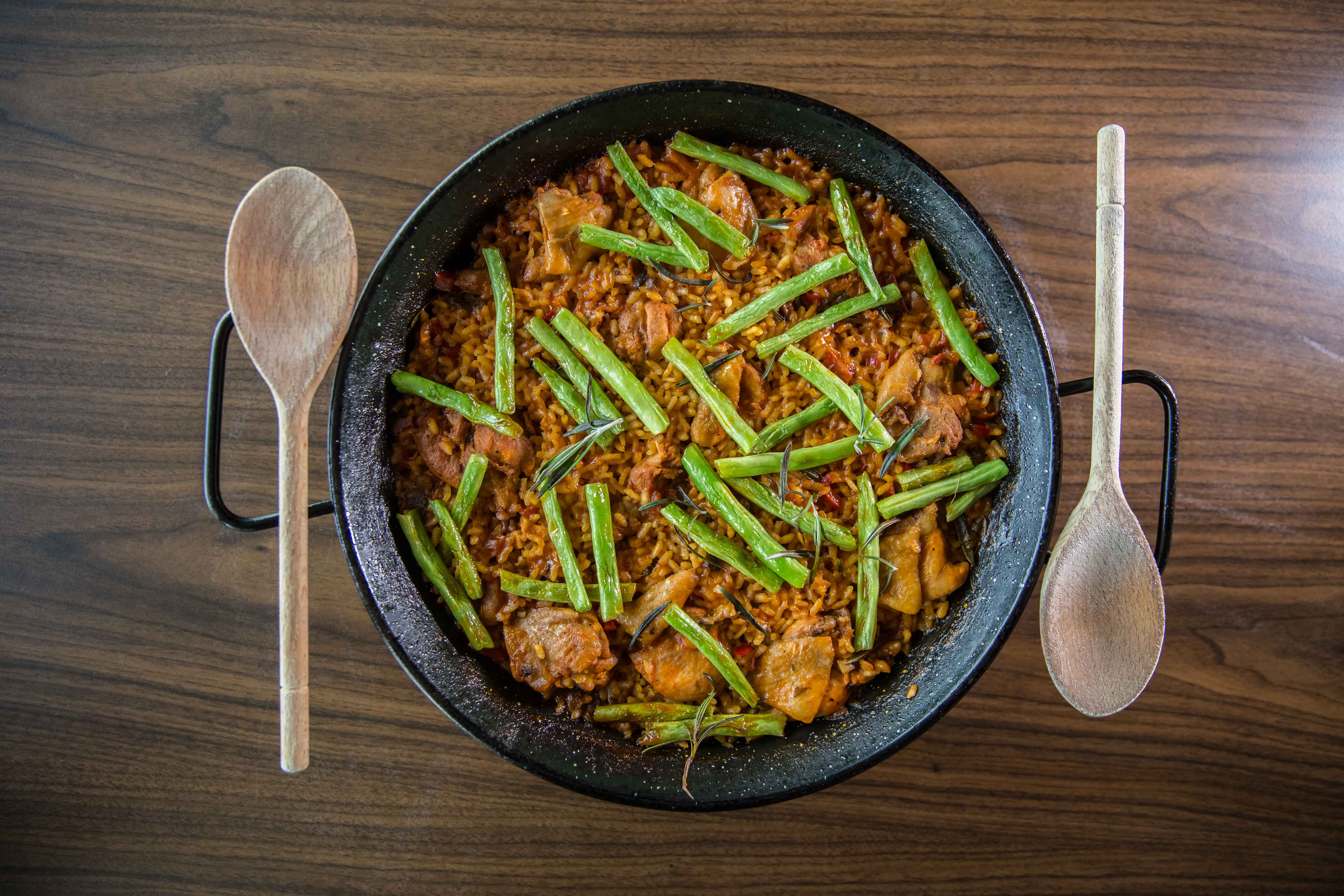Fill your tummy with this generous portion of Paella Valencia topped with chunks of juicy chicken and savoury string beans.