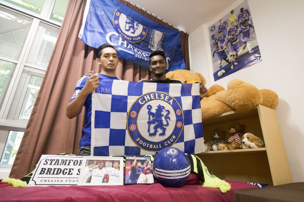 Despite being a Liverpool fan, Martyn Daniel (left), lets roommate Rishi Ramathas (right) deck out the room in shades of Chelsea blue for the sake of friendship. PHOTO: BELICIA TEO