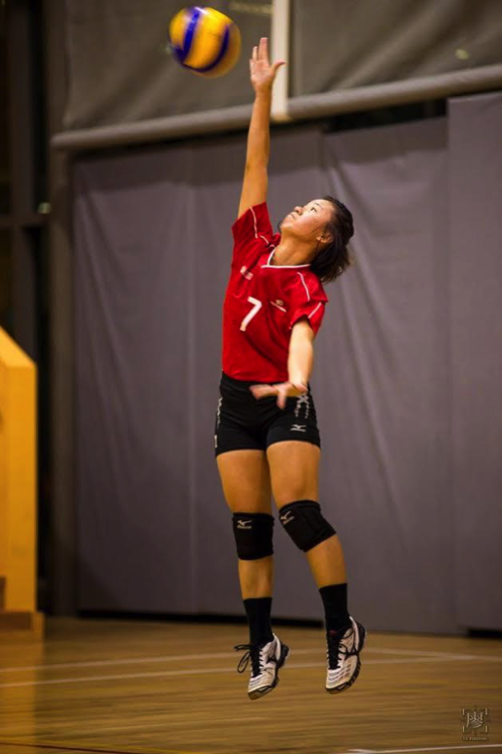 SERVING THE BALL: Cassandra jumps high enough to palm the ball over the net.