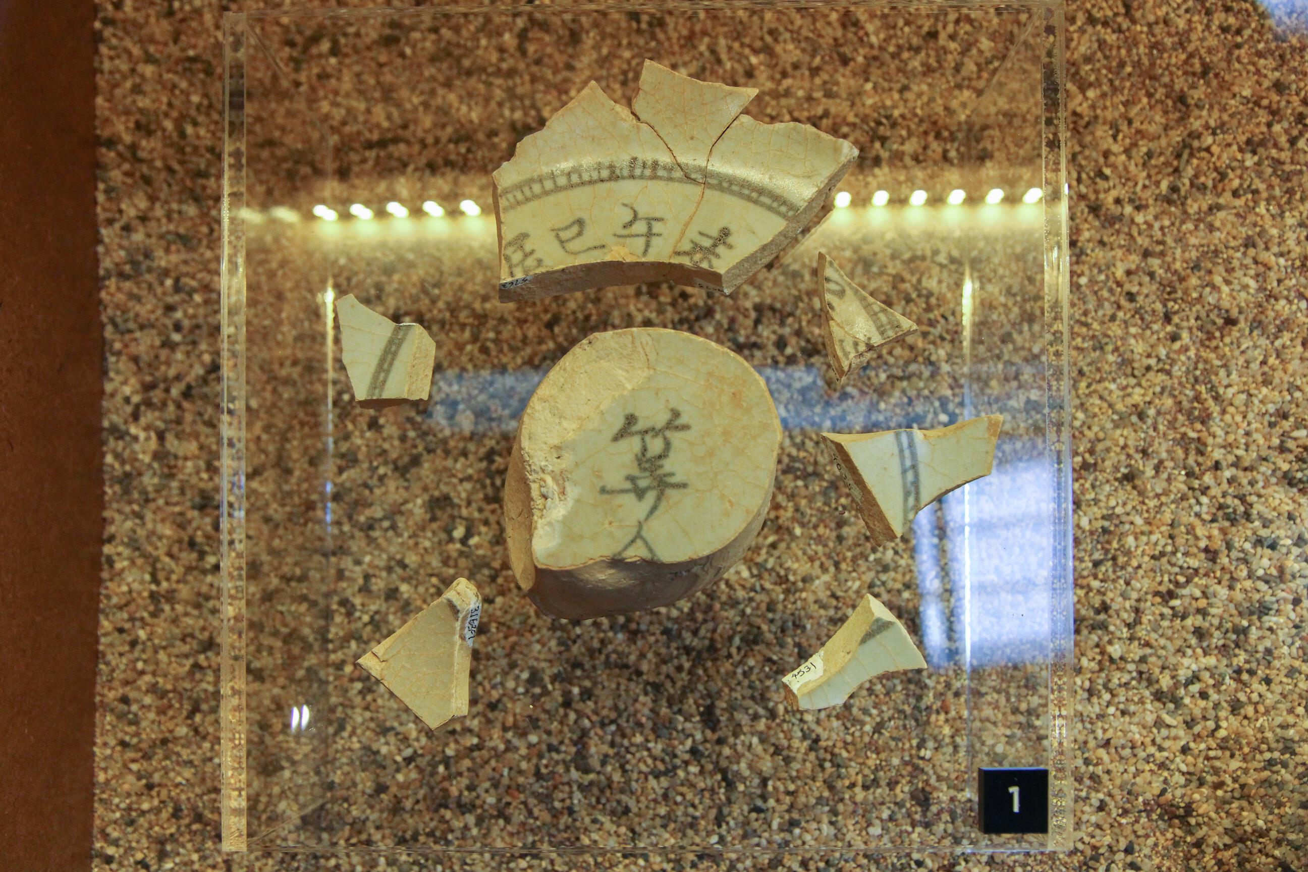 Bowl compasses work by floating a needle on a cork in a bowl filled with water: the magnetised needle will point north when it reaches a standstill. Only fragments of the compass have been recovered, but Chinese characters for compass directions written on the glaze confirm that it was used for navigation.