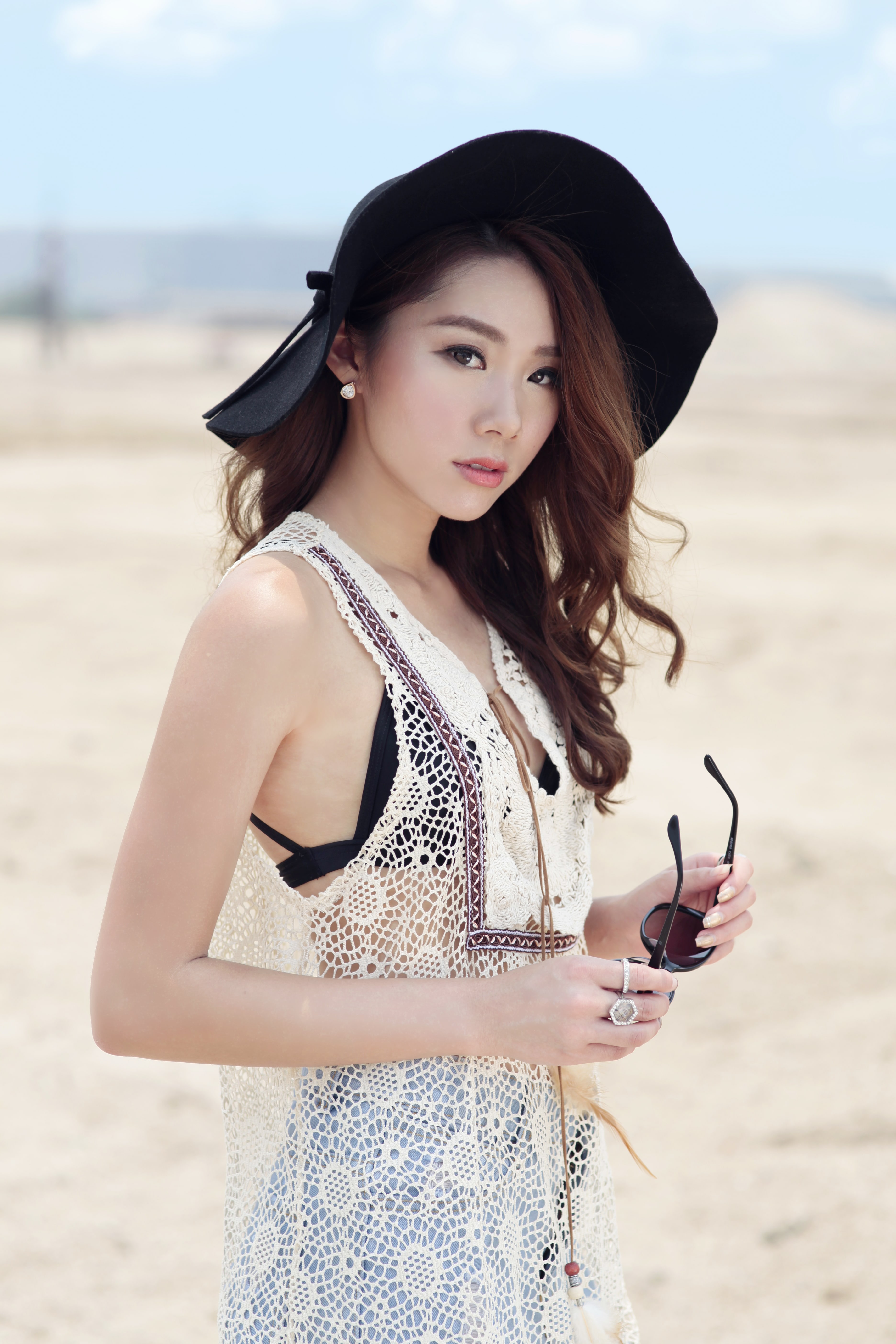 The Eden Bikini: Kitsi, $32.90; A Boho Life Crochet Beach Dress: Tea For Three, $28; Light Blue Ripped Cut-Offs: Tea For Three, $27; Midas Heeled Sandals: Her Velvet Vase, $38; Others: Model’s own.