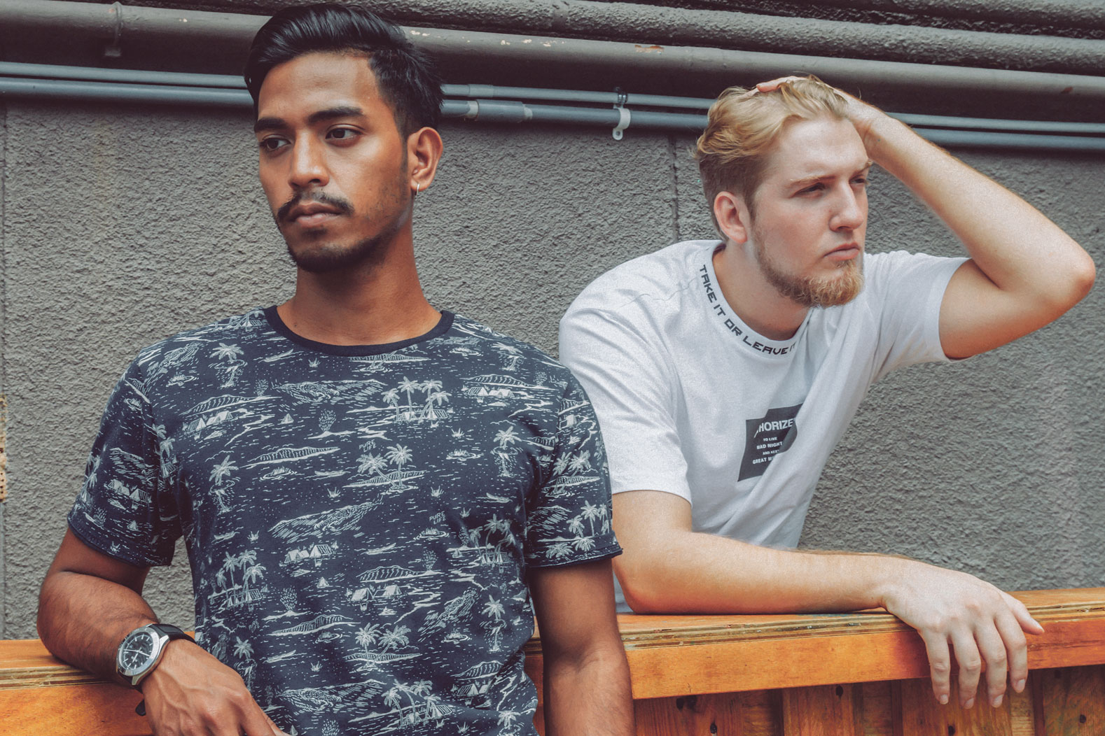 On Raymond (right): Top, from Bershka, $29.90; Shirt (worn as jacket), from Pull & Bear, $45.90; Pants, shoes and watch, Model’s own.