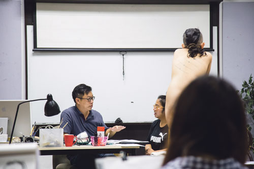 Foundation Drawing lecturer Mr Don Low, who has been teaching the class for six years, giving advice to his student during an in-class consultation for final submission. Every foundation year batch has roughly eight classes that hold 15 to 20 students each.